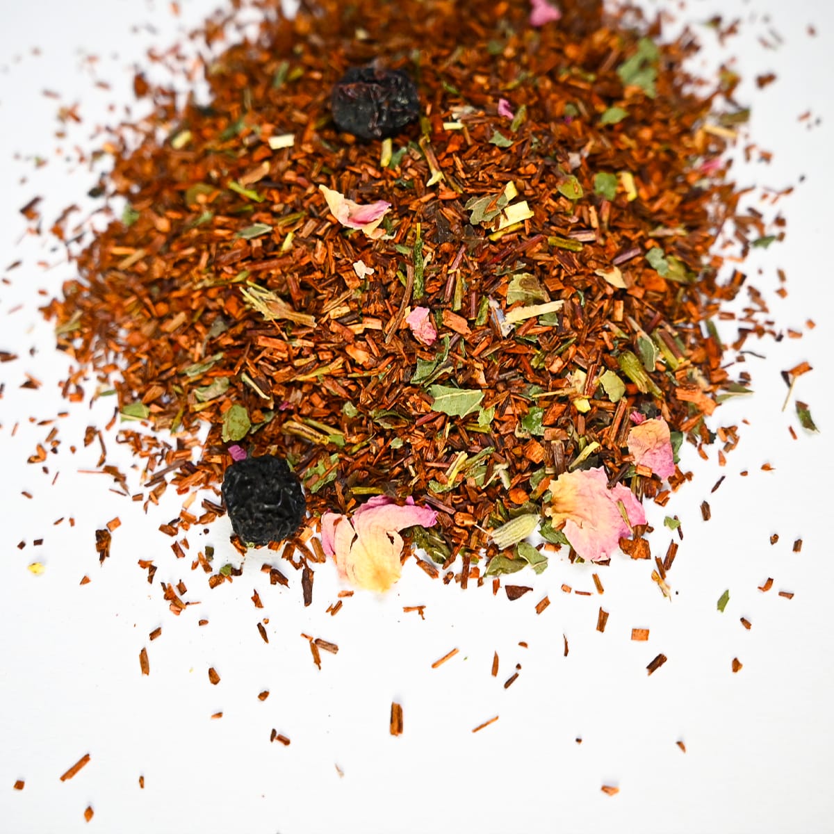 Rooibos naturel, rooibos vert, mélisse, pétales de rose, fleurs de bleuet, lavande, aronia.