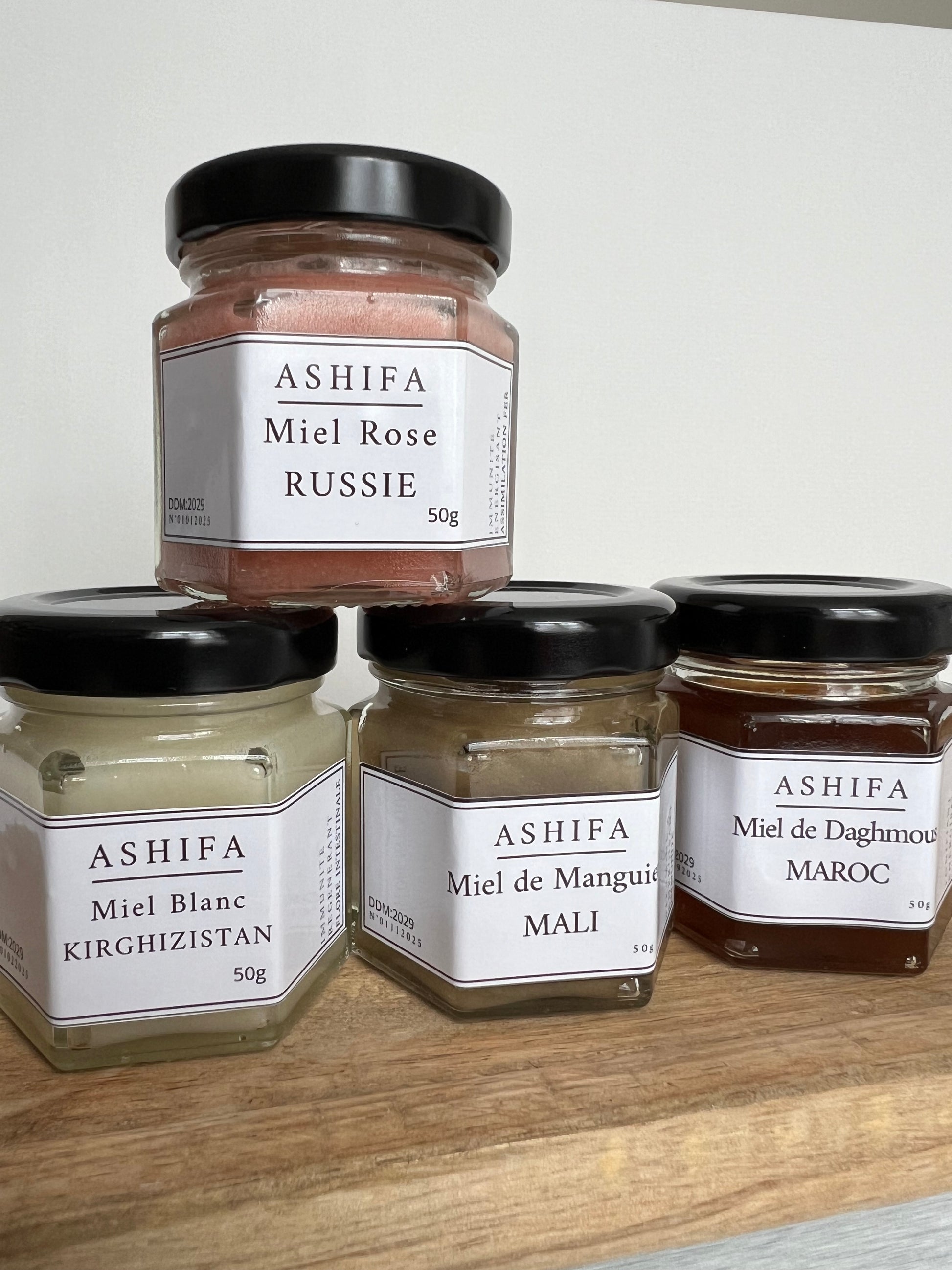 Lot de 4 miels pour découvrir nos délices et profiter des bienfaits du quatre coins du monde.